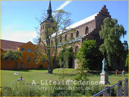 A Life in Odense - Photo Gallery - Skt.Knuds教会の裏。右下にはアンデルセン像が見えます。芝生でひなたぼっこしてる人達、見えますか? Photo Gallery目次へ ・ ホームへ