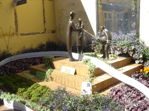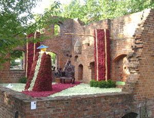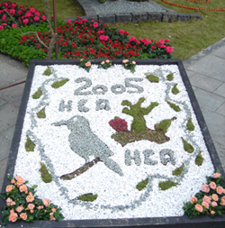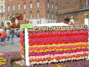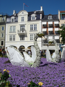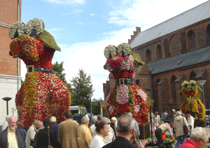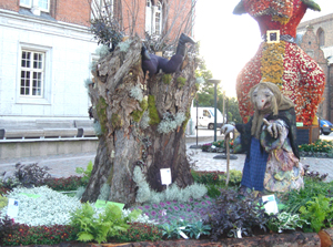 ![]() 花で埋め尽くされた市庁舎前広場 水面に見立てて紫の花が敷かれています 水の上には葉っぱに乗って蝶にひかれる女の子が。 手前には緑の大きなヒキガエルもいます。 |